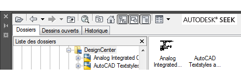Les onglets Dossiers, Dessins ouverts et Historique, ainsi que le bouton Autodesk Seek situé dans l'angle supérieur droit offrent plusieurs méthodes d'accès au contenu.