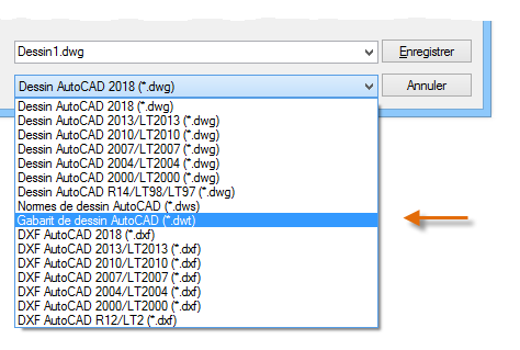 Vous pouvez enregistrer un fichier dessin (.dwg) en tant que fichier de gabarit de dessin (.dwt). Vous pouvez également ouvrir un fichier gabarit de dessin existant, le modifier, puis l'enregistrer, en utilisant éventuellement un autre nom de fichier.