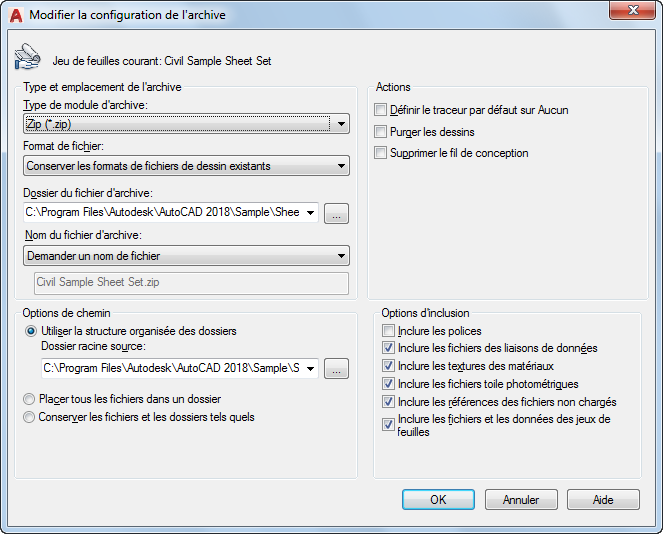 Inclut le fichier de données du jeu de feuilles (DST), les fichiers dessin de bloc d'étiquette, les fichiers dessin de bloc repère de vue et les fichiers gabarit de dessin (DWT) avec le module d'archive.