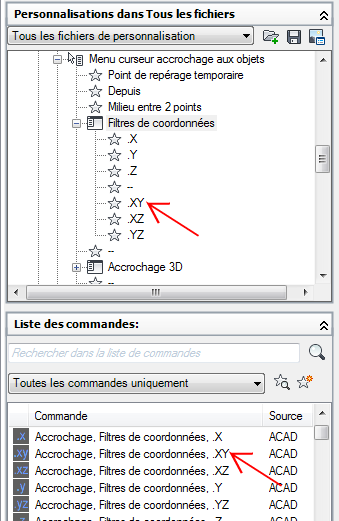 Cette liste est filtrée afin de ne laisser voir que les commandes définies par l'utilisateur qui ont été ajoutées aux fichiers de personnalisation chargés.