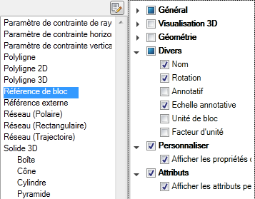 Contrôle de l'affichage des propriétés personnalisées et des attributs pour les références de bloc