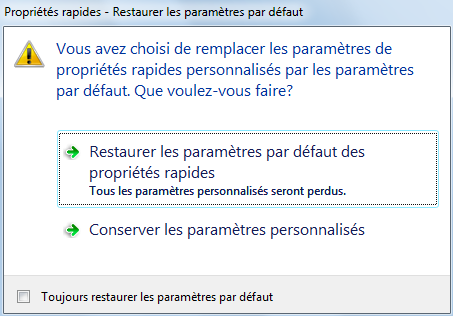 - Cliquez sur Restaurer les paramètres par défaut des propriétés rapides.