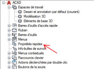- Dans le volet Personnalisations dans <nom de fichier> de l'onglet Personnaliser, cliquez avec le bouton droit de la souris sur Propriétés rapides.