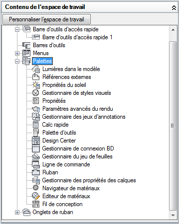 Utilisez l'éditeur Personnaliser l'interface utilisateur pour contrôler l'affichage de la barre d'outils d'accès rapide, des groupes de fonctions et des onglets du ruban, des palettes d'outils, des barres d'outils et des menus déroulants.