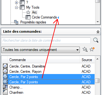 7. Dans le volet Liste des commandes, faites glisser la commande que vous voulez ajouter au sous-menu dans le volet Personnalisations dans <nom de fichier>.