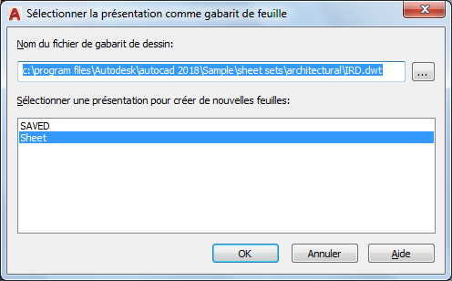 Indique le chemin de dossier, le fichier gabarit de dessin (DWT) et le nom de présentation à utiliser pour créer des feuilles.