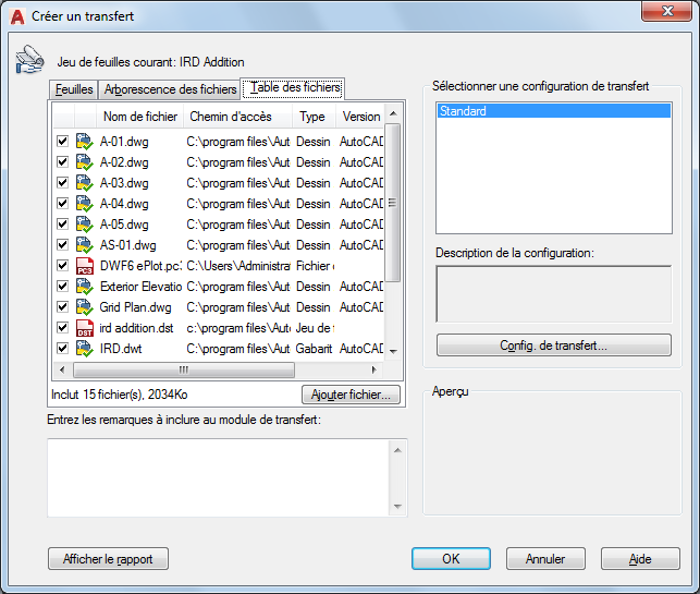 Affiche les informations de rapport incluses dans le module de transfert. Inclut les éventuelles remarques de transfert entrées et les remarques de distribution générées automatiquement et détaillant les étapes à suivre pour que le module de transfert fonctionne correctement. Par exemple, si des polices SHX sont détectées dans l'un des dessins de transfert, on vous indique où ces fichiers doivent être copiés pour qu'ils soient détectés sur le système sur lequel le module de transfert est installé. Si vous avez créé un fichier texte de notes par défaut, celles-ci sont également incluses dans le rapport.