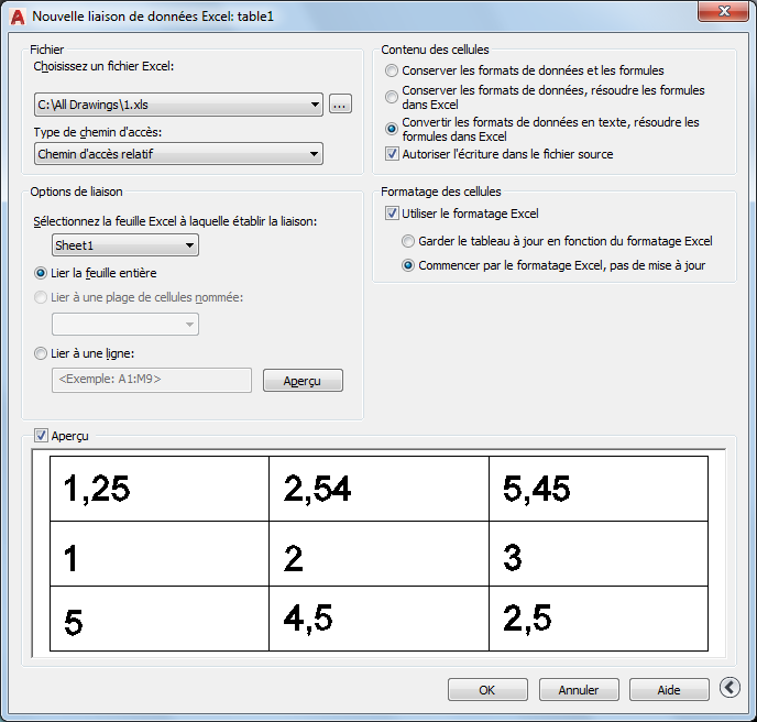 Lie les données d'une feuille de calcul créée dans Microsoft Excel à une table de votre dessin.