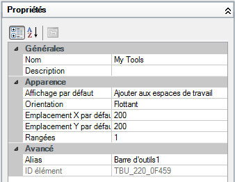 Remarque : Les modifications apportées ici aux propriétés d'une barre d'outils concernent uniquement l'apparence initiale de la barre d'outils après le chargement du fichier de personnalisation (CUIx). Il est recommandé d'utiliser un espace de travail pour contrôler l'apparence d'une barre d'outils.