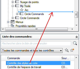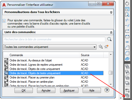 - Dans le volet Liste des commandes, faites glisser la commande que vous voulez ajouter jusqu'à la barre d'outils de votre choix dans le volet Personnalisations dans <nom de fichier>.