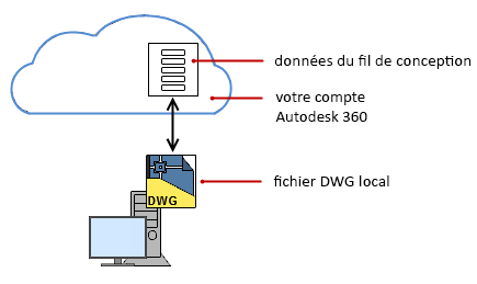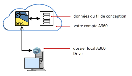 Si vous ne souhaitez pas enregistrer des fichiers de dessin dans votre compte A360, vous pouvez les stocker localement sur le disque dur de votre ordinateur. Dans ce cas, les données du fil de conception de ces dessins restent stockées dans A360, mais l'association aux données du fil de conception est gérée par un ID de fil de conception unique, un lien incorporé dans votre dessin vers vos données de fil de conception.
