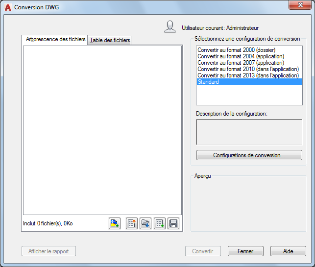 Ouvre une boîte de dialogue standard de sélection de fichiers, qui vous permet de sélectionner les fichiers dessin à ajouter à la liste de conversion. Ce bouton est disponible dans les onglets Arborescence des fichiers et Table des fichiers.