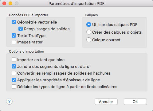 Détermine les options d'importation de la géométrie, des remplissages, des images raster et des objets texte TrueType à partir d'un calque sous-jacent ou d'un fichier PDF spécifié.