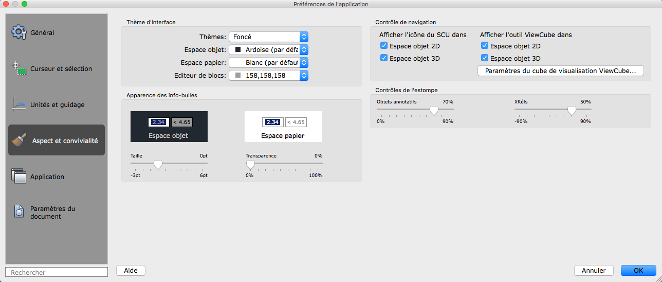 Contrôle le thème à appliquer aux éléments, tels que la barre d'état, les palettes et les fenêtres de dessin. Vous pouvez choisir entre un thème sombre ou clair.