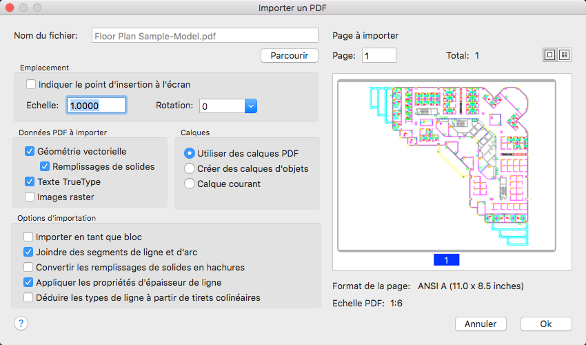 - Crée des calques AutoCAD pour tous les types d'objets généraux suivants, importés depuis le fichier PDF : PDF_Geometry, PDF_Solid Fills, PDF_Images et PDF_Text.