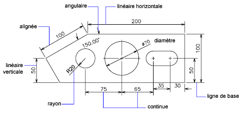 Vous pouvez créer des cotes pour différents types d'objet dans plusieurs orientations. Les types de base de la cotation sont