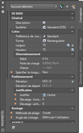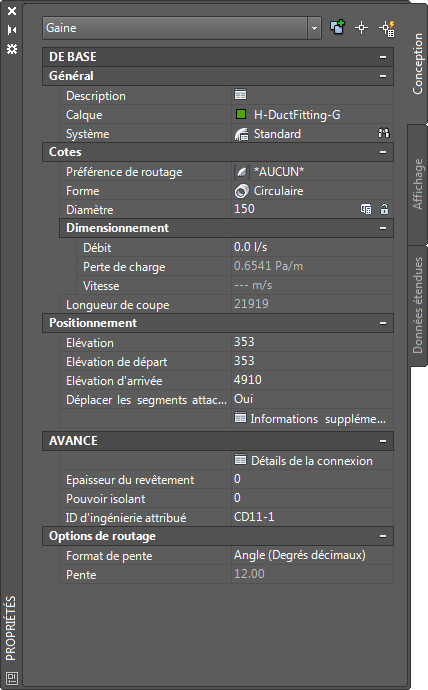 - Si aucune valeur de capacité ne figure dans les boîtes de dialogue Ajout de gaines et Modifier la gaine, les valeurs de perte de charge et de vitesse indiquées correspondent aux valeurs spécifiées pour la définition du système de gaines sous l'onglet Paramètres de conception. Pour définir les paramètres de conception de la définition du système de gaines, reportez-vous à la rubrique Spécification du mode de calcul de la taille de la gaine.