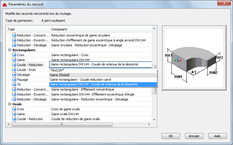 Une préférence de routage de composant de gaine inclut un ou plusieurs intervalles de taille pour les composants de gaine et les raccords, notamment les coudes, les tés, les croix, les piquages et les réductions. Le logiciel organise les intervalles de taille en fonction des tailles nominales des gaines. Vous pouvez utiliser les composants de gaine et les raccords d'un intervalle de taille spécifique lors du positionnement de la conduite de gaine. Les composants de gaines disponibles sont spécifiques au type de connexion que vous sélectionnez. L'exemple suivant montre les préférences de routage pour les connexions de type joint coulissant d'après la forme du profil global.