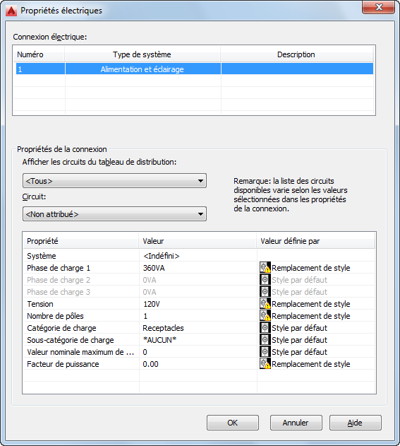 La fiche de travail Propriétés électriques répertorie les connexions de l'appareil et affiche le type de système et la description de chaque connexion. Ces attributs d'appareil dépendent du style d'appareil. Pour les modifier, vous devez modifier les connexions dans le style.