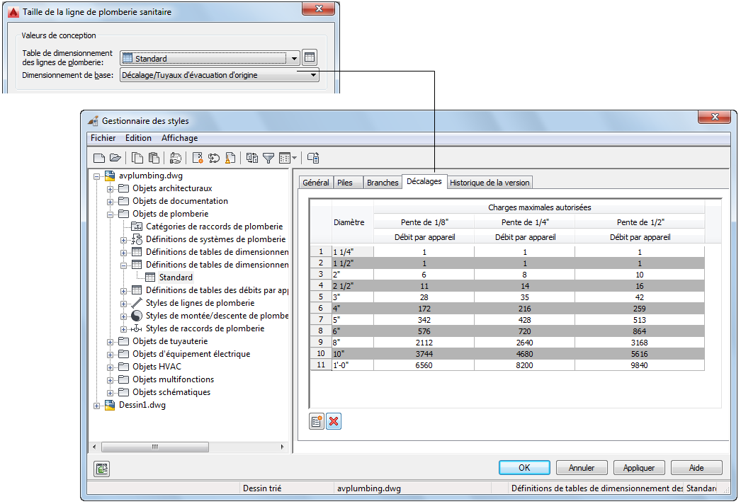 Lorsque vous définissez la conduite sanitaire en tant que décalage ou en tant que tuyaux d'évacuation d'origine, le module de plomberie effectue le calcul de dimensionnement à l'aide des informations de l'onglet Décalages de la table de dimensionnement de ligne de plomberie sanitaire (table de dimensionnement des canalisations), dont les définitions se trouvent dans le gestionnaire des styles.
