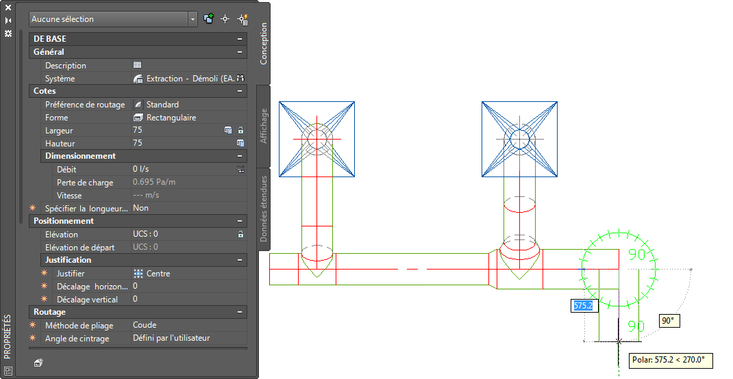 Si vous avez affecté des valeurs de flux à un équipement de sortie, l'outil de dimensionnement en temps réel permet de déterminer les tailles impliquées dans le réseau de gaines lorsque vous dessinez les longueurs de gaine. Par ailleurs, vous pouvez utiliser cet outil si vous modifiez les longueurs de gaine existantes.