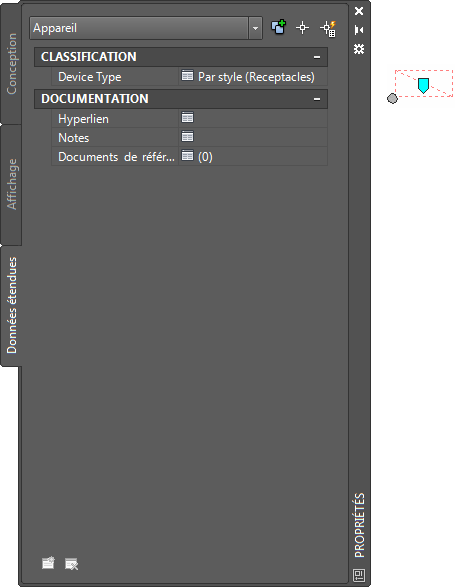 Les appareils d'un dessin constituent des occurrences de style d'appareil. Dès lors, ils sont associés à une propriété pour chaque définition de classification dans le style d'appareil. L'onglet Données étendues de la palette des propriétés permet d'afficher ou de remplacer la classification d'un ou plusieurs appareils du dessin.