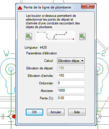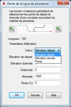 Dans la boîte de dialogue Pente de la ligne de plomberie, cliquez sur Sélectionner un point de départ de conduite ou sur Sélectionner un point d'arrivée de conduite.