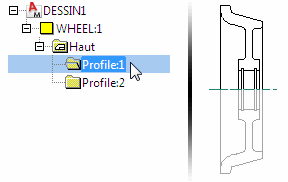 Dans cet exemple, le dossier Profile:1 contient le profil de la roue supérieure. Profile:2 est une autre occurrence de ce dossier, créée par la mise en miroir de Profile:1. Si vous modifiez un profil, l'autre est automatiquement mis à jour.