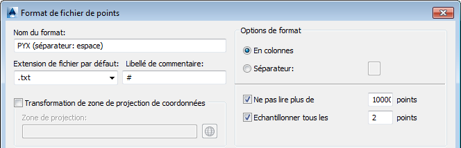 Figure 1 : Paramètres pour le filtrage du fichier de point