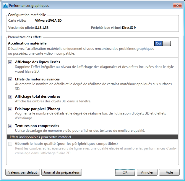 Les paramètres des performances graphiques sont disponibles via la saisie de la commande AutoCAD CONFIGGRAPHIQUE. Cette opération affiche la boîte de dialogue Performances graphiques, comme illustré dans la figure 15.