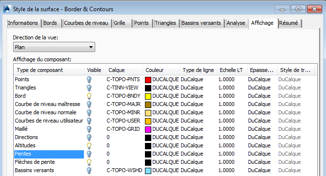 Dans la boîte de dialogue Style de la surface - Existing Ground Contours, les composants Bord, Courbes de niveau maîtresses et Courbes de niveau normales sont définis comme visibles. Ces composants déterminent l'affichage de la surface dans le dessin. Lorsqu'ils sont activés, la surface s'affiche comme illustré dans la figure 6.