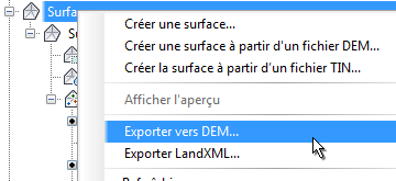 AutoCAD Civil 3D vous permet d'exporter des fichiers DEM à partir d'une surface. Lors de l'exportation, vous pouvez développer l'espacement de la grille pour réduire la taille du fichier. La figure 3 illustre la sélection du menu utilisée pour démarrer le processus d'exportation.