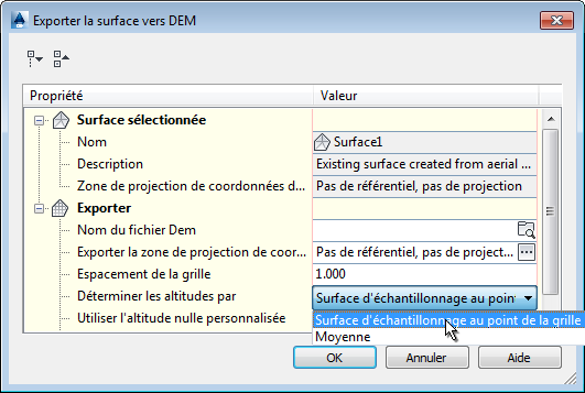 La méthode de détermination de l'altitude à chaque point est un paramètre d'exportation important. Vous pouvez choisir d'échantillonner l'altitude de la surface au niveau du point de la grille ou de calculer l'altitude moyenne à partir des points avoisinants. La deuxième méthode (établissement d'une moyenne) prend plus de temps. Pour plus d'efficacité, utilisez l'option d'échantillonnage de la surface, comme indiqué dans la figure 4.