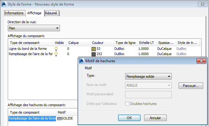Pour la conception de projets 3D, vous pouvez créer des éléments de profil type de façon plus efficace en vous assurant que le style de forme de chaque élément est défini sans remplissage ou du moins avec un remplissage uni plutôt que des motifs de hachure. La figure 2 illustre la boîte de dialogue Style de forme dans laquelle vous pouvez définir un style de forme d'élément de profil type.