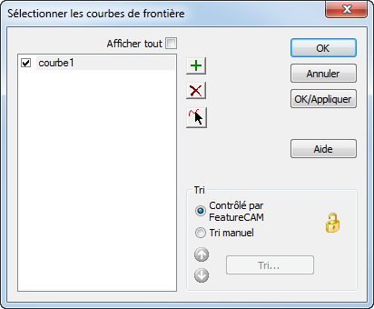 Pour afficher la boite de dialogue Sélectionner courbe de frontière, cliquez sur Courbes... dans l'onglet Dimensions de la boite de dialogue des propriétés de la feature de fraisage.