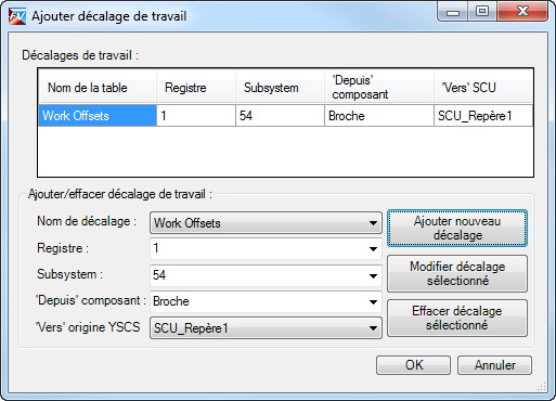 - Si Décalages de travail est sélectionné, entrez le décalage de posage correspondant dans le champ Registre (tel que 54 pour G54 ou 55 pour G55).