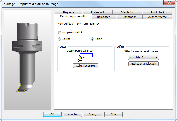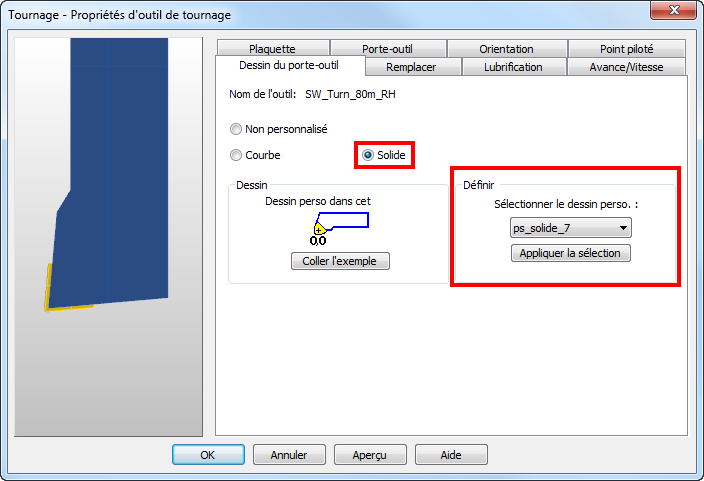 - Dans l'onglet Dessin de porte-outil de la boite de dialogue de propriétés de l'outil, sélectionnez Solide, puis sélectionnez le solide dans la liste Sélectionner le dessin perso..