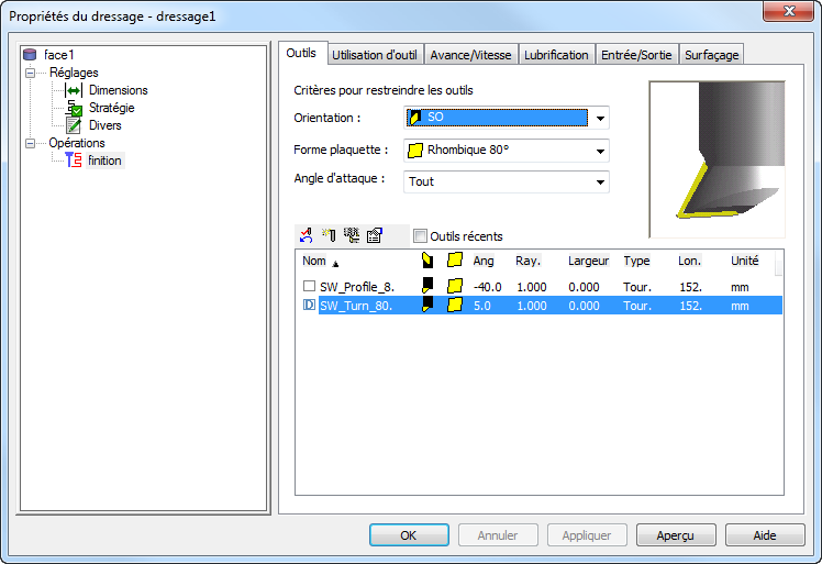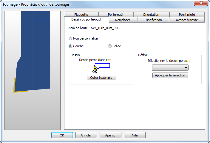 - Le porte-outil solide est affiché dans la fenêtre aperçu dans l'onglet ensuite vous pourrez voir la position de la plaquette relative au porte-outil :