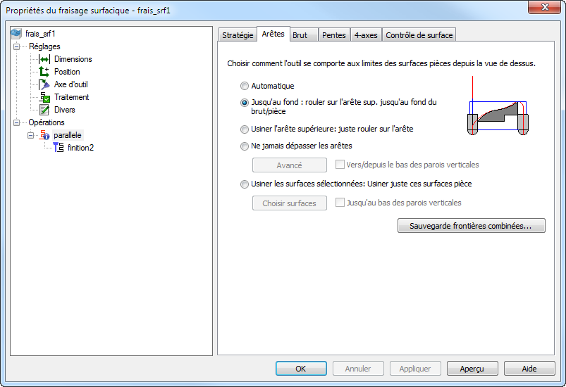 Cet onglet vous donne des options pour définir comment les parcours d'outils sont générés près des arêtes de surface.