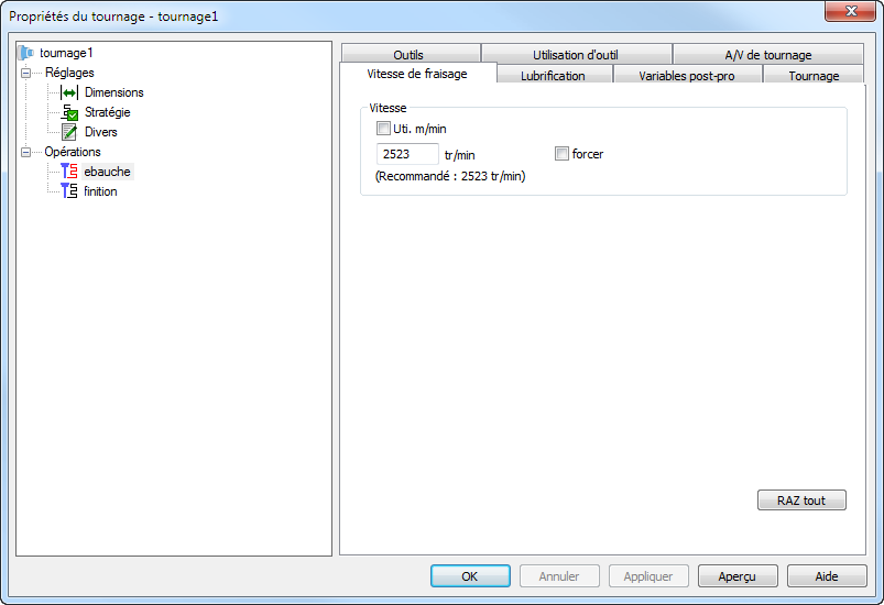 Cet onglet est disponible quand vous utilisez les parcours d'outils de tournage/fraisage (usinage utilisant un brut rotatif et une fraise rotative)