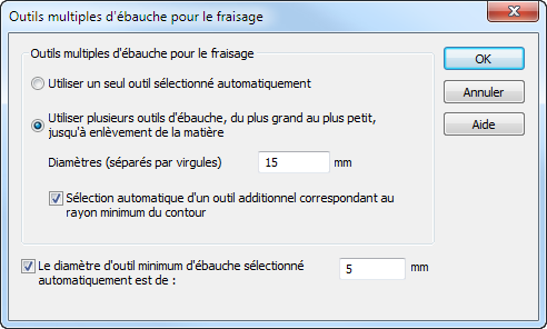 Utiliser plusieurs outils d'ébauche — Cette option usine la pièce avec une liste d'outils que vous fournissez. Chaque outil ne découpe que les régions qui n'ont pas été précédemment usinées. Dès que la pièce à été complètement usinée, plus aucune opération n'est créée avec les petits outils. Ceci est une bonne option à sélectionner si la pièce comporte des coins vifs, mais soyez conscient que votre pièce aura besoin de plus d'outils et de changements d'outils. Vous devriez entrer les diamètres d'outil que vous voulez utiliser. Séparez chaque diamètre par une virgule. Avec cette option, vous pouvez sélectionner Sélection automatique d'un outil additionnel correspondant au rayon minimum du contour. Si vous sélectionnez cette option, vous devriez lister quelques grands diamètres pour plusieurs ébauches, puis laissez FeatureCAM sélectionner l'outil pour la passe d'ébauche finale.