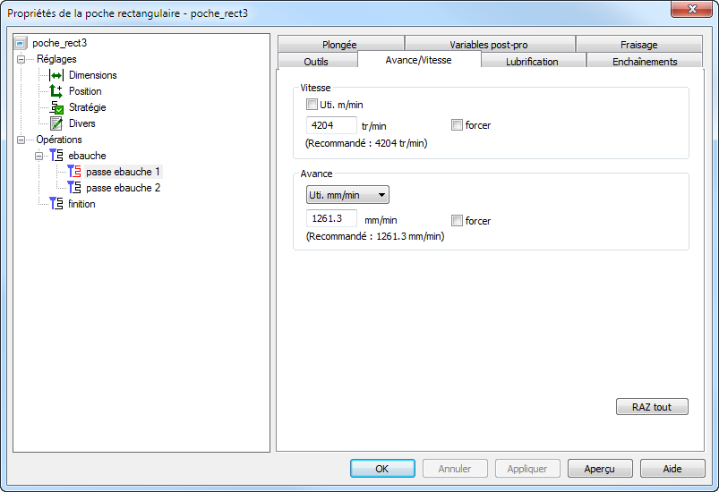 Vous pouvez utiliser l'onglet Avance/Vitesse de la boite de dialogue de propriétés de feature de fraisage pour voir et éditer les réglages d'avances et vitesses pour l'opération sélectionnée dans l'arborescence.