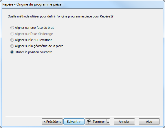 - Aligner sur une face du brut — Sélectionnez cette option si vous voulez aligner le repère avec le centre ou avec un coin d'une des face du brut, ou pour choisir explicitement une position.