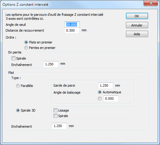 Recouvrement — Entrez la taille de la zone de recouvrement entre l'usinage des zones raides et peu inclinées. Cela réduit les marques sur le modèle causé par un changement soudain entre l'usinage de zones raides et peu inclinées.