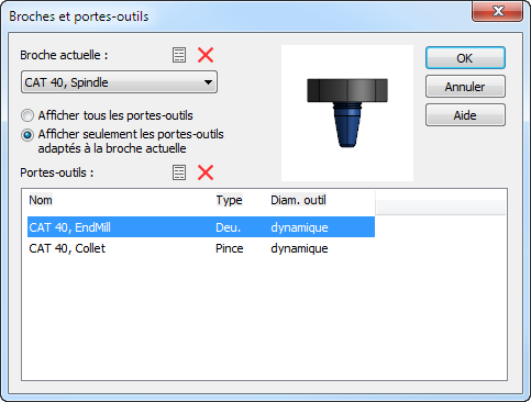 Utilisez la boite de dialogue Broches et portes-outils pour voir, éditer et créer de nouvelles broches et de nouveaux portes-outils.