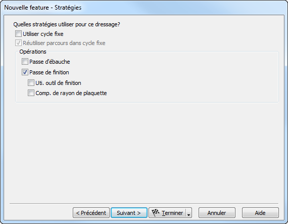 Utilisez la page Nouvelle feature - Stratégies de l'assistant de nouvelle feature pour spécifier la stratégie d'usinage pour la feature.