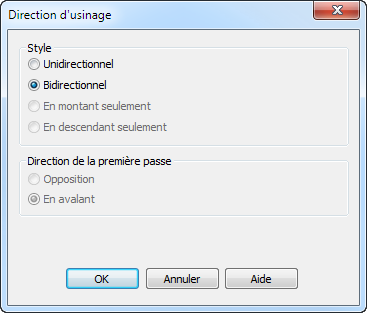 - Bidirectionnel — Si actif, les paramètres décroissant ou croissant contrôlent la direction d'usinage de la première passe.