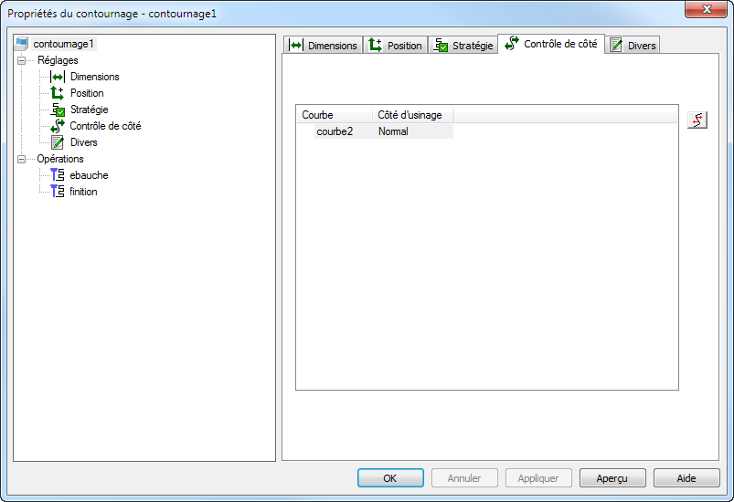 Sélectionnez un nom de courbe dans le tableau. Une flèche rouge est affichée dans la fenêtre graphique pour montrer le côté d'usinage actuel, par exemple :