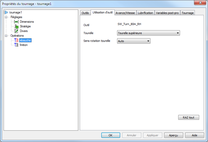 Tourelle — Si vous effectuez un tournage multi-tourelles, sélectionnez quelle tourelle utiliser pour usiner l'opération sélectionnée.