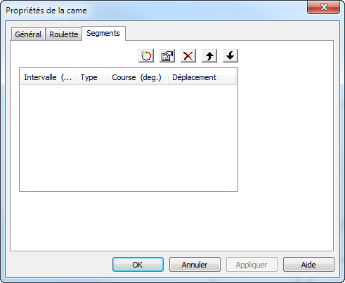 L'onglet Segments définit les segments de la came et leurs paramètres spécifiques. Les arcs de segments sont listés en sens trigo.